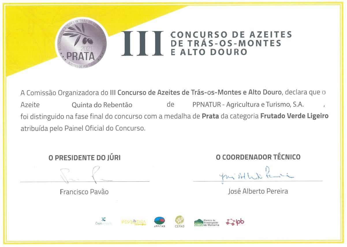 O azeite Quinta do Rebentão, ganhou a Medalha de Prata na Categoria Frutado Verde Ligeiro, no III Concurso de Azeites de Trás-os-Montes e Alto Douro, onde estiveram presentes 79 produtores.